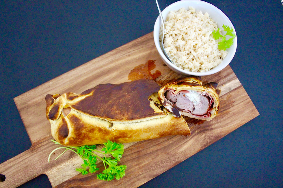 Zuerst das Schweinefilet sorgfältig filetieren. Danach gut abwaschen und es mit Pfeffer und Salz würzen. Dann das Filet von jeder Seite ca. 5 Minuten scharf anbraten. Den Blätterteig auswallen und in die Mitte die Rohschinkenstreifen legen. Darauf dann das Filet legen und in der Mitte einschneiden. Den Schnitz grosszügig mit Philadelphia auffüllen. Dann das Filet mit dem Blätterteig verschliessen und es bei 200°C für ca. 30 Minuten backen lassen. Den Reis als kochen und als Beilage servieren.